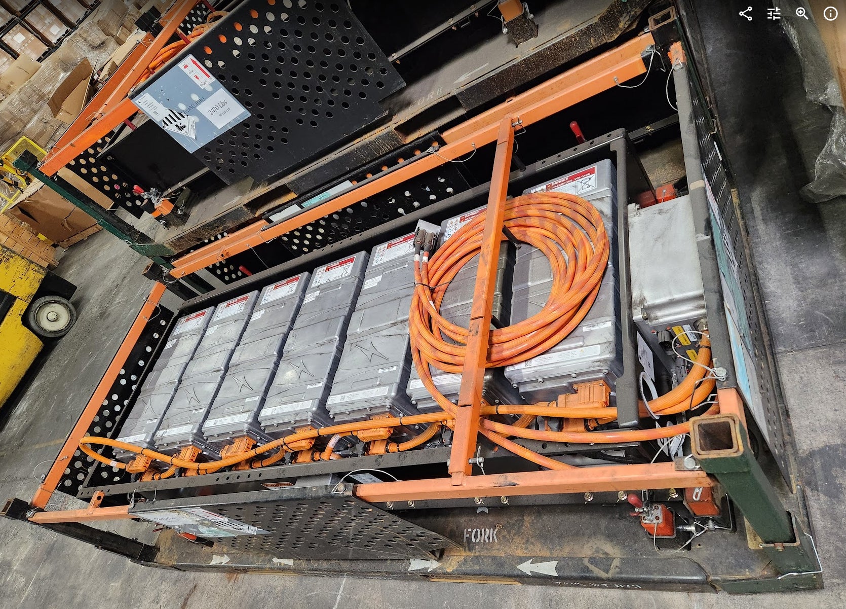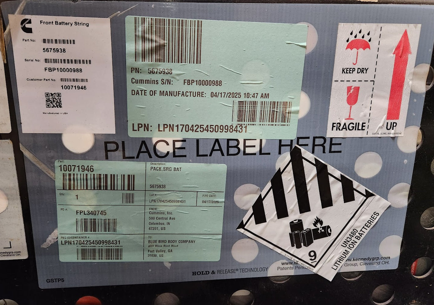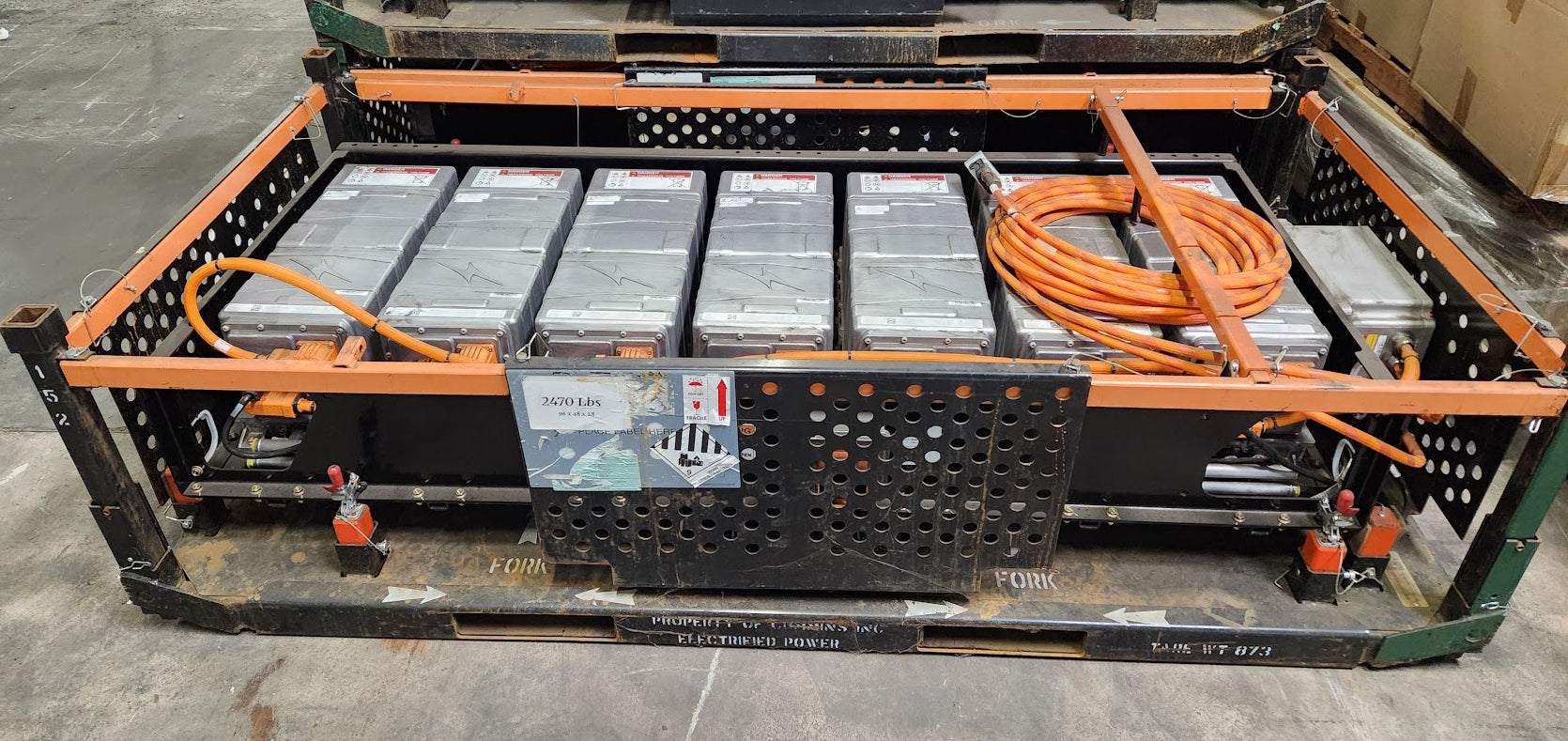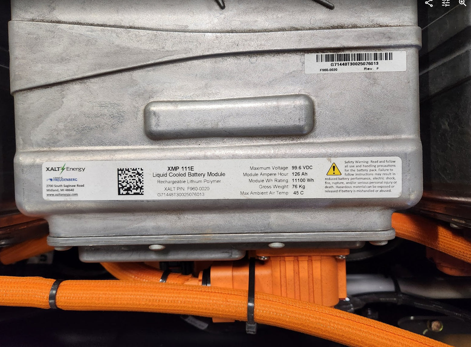 We do not have too many details on this item. It appears to be a front battery pack for an EV made by Blue Bird. It is apparently designed by Cummins Electrified Power and the battery modules are from XALT Energy. There are 7 battery modules along with all of the cabling shown, and a Cummins 5636563 box.