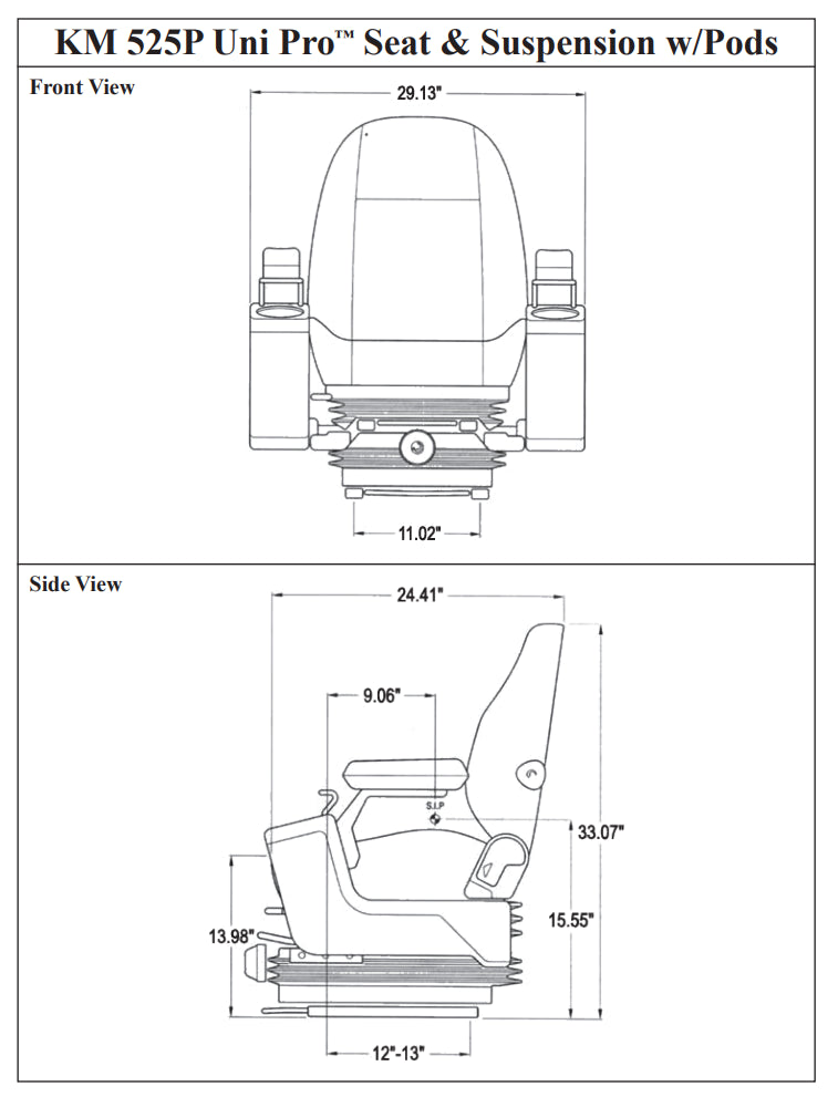 The Uni Pro™ - KM 525P Seat & Suspension with control pods is a quality made replacement seat with heavy-duty mechanical suspension assembly designed for construction applications.