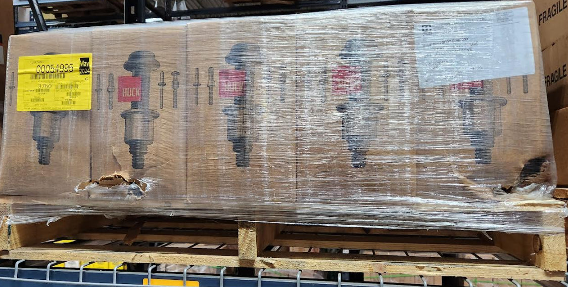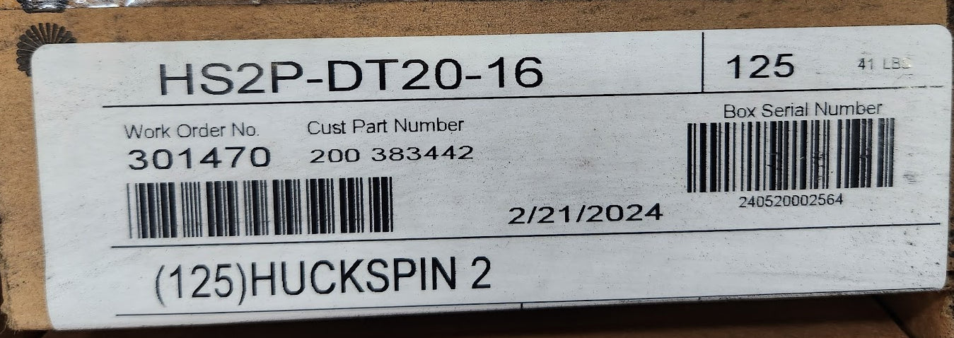Huck, HS2P-DT20-16, Huck-Spin II Lockbolts, Unit of Measure: Inch, Decimal Equivalent Diameter: 0.625 Inch, Minimum Grip: 0.750 Inch, Maximum Grip: 1.250 Inch, Grip Range: .750-1.250 Inch, Round Flanged Head, Steel Body Material, Material Detail: High Carbon Steel, Zinc Plate Black Finish, Finish Detail: Zinc Black Dyed Trivalent Chromate ASTM B633, Class 8, Type 3, .0004 Thick, Maximum Hole Size: 0.688 Inch, Head Diameter: 1.330 Inch, Head Height: 0.499 Inch, Pin Length to Lock Groove: 0.150 Inch, Pintail Length: 0.65 Inch, Underhead Length to Min Grip: 0.750 Inch, Underhead Length to Pintail: 2.950 Inch, Style: Huck-Spin II Unified, Type: Lockbolt Pin Unified, Shear Strength lbf: 26000, Tensile Strength lbf: 36600, RoHS Compliant: Yes, Country of Origin: United States, ECCN: EAR99, HTS Code: 7318.29.0000