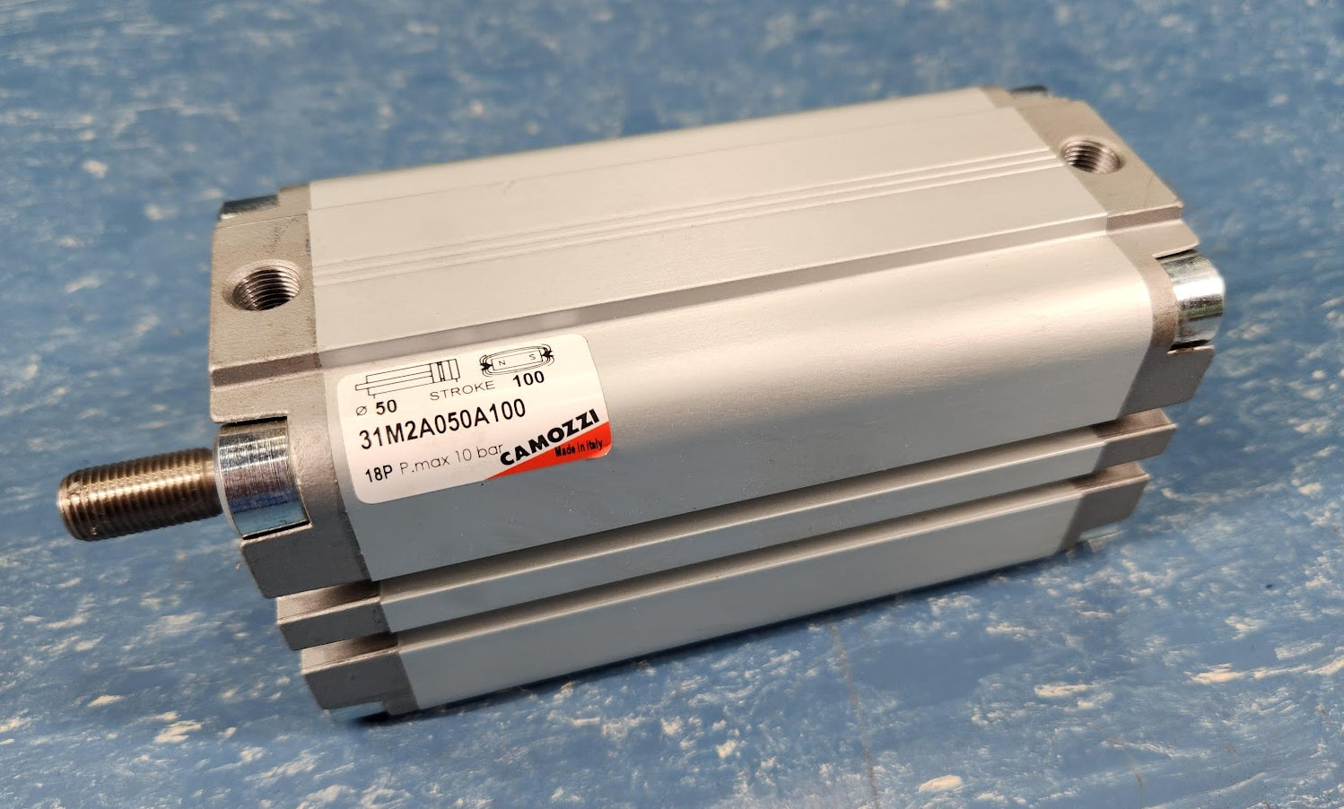 CAMOZZI 31M2A050A100 – 50mm Bore, 100mm Stroke, Double Acting, Male Rod Thread, Series 31 Compact Cylinder Aluminum Body Camozzi series 31 compact single and double acting cylinders are perfect for confined spaces. These cylinders are suitable for use with feet brackets. Guides are inserted in the external profile parallel to the sliding axis on three sides. These guides are used to locate the switches that sense the piston position.