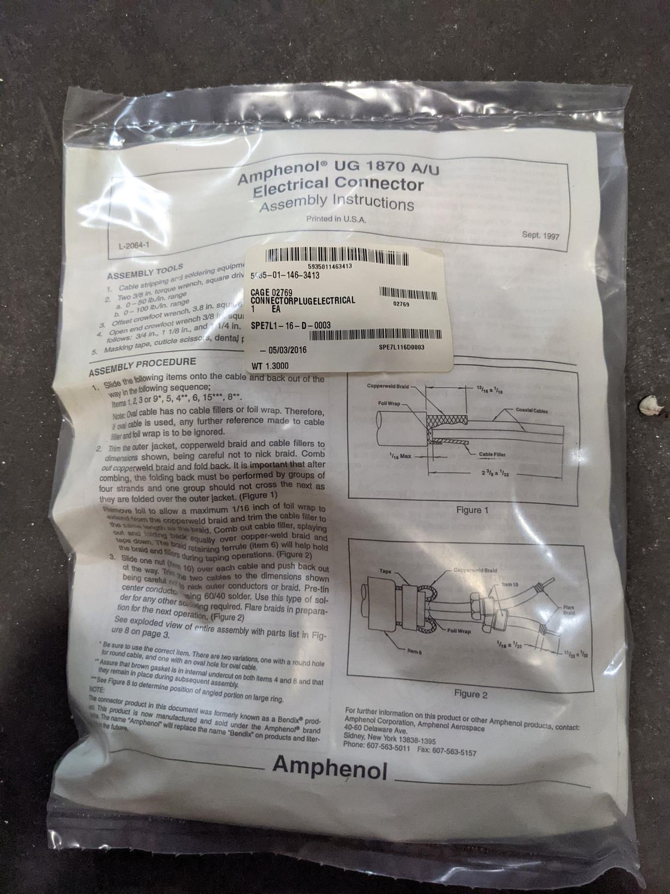 1890000 A3000760-1 MIL-C-55661 UG-1870A/U, BODY STYLE STRAIGHT SHAPE, INTERNAL COUPLING OVERALL LENGTH 9.650 INCHES MAXIMUM OVERALL DIAMETER 2.125 INCHES MAXIMUM MATING END QUANTITY 1 CONTACT POSITION ARRANGEMENT STYLE TWIN-X SINGLE MATING END CONTACT REMOVABILITY REMOVABLE SINGLE MATING END ALL CONTACT GROUPINGS POLARIZATION METHOD CONTACT SHELL TYPE SOLID CONNECTOR LOCKING METHOD BAYONET LATCH CONNECTOR CABLE STRAIN RELIEF METHOD BASKET WEAVE GRIP TERMINAL LOCATION BACK SINGLE MATING END ALL CONTACT GROUPINGS CONTACT MATERIAL COPPER ALLOY SINGLE MATING END ALL CONTACT GROUPINGS INSERT MATERIAL PLASTIC SINGLE MATING END TERMINAL TYPE CRIMP SINGLE MATING END ALL CONTACT GROUPINGS SHELL MATERIAL ALUMINUM ALLOY SHELL MATERIAL DOCUMENT AND CLASSIFICATION QQ-A-225 FED SPEC SINGLE MATERIAL RESPONSE INCLUDED CONTACT QUANTITY 1 SINGLE MATING END 1ST CONTACT GROUPING INCLUDED CONTACT QUANTITY 1 SINGLE MATING END 2ND CONTACT GROUPING INCLUDED CONTACT TYPE COAXIAL PIN SINGLE MATING END 1ST CONTACT GROUPING INCLUDED CONTACT TYPE COAXIAL SOCKET SINGLE MATING END 2ND CONTACT GROUPING, MISSILE, MINUTEMAN III, LGM-30 RADIO TERMINAL SET TROPOSCATTER RADIO TERMINAL SYSTEM ANTRC170