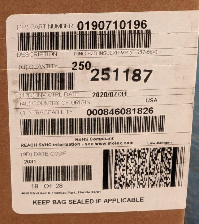 Molex 190710196 Ring Tongue Terminal InsulKrimp 657 Series 5/16” Stud 6 AWG BOX of 250