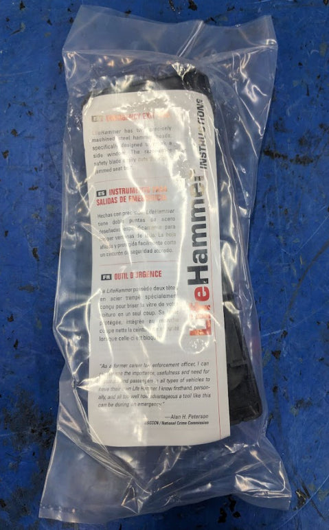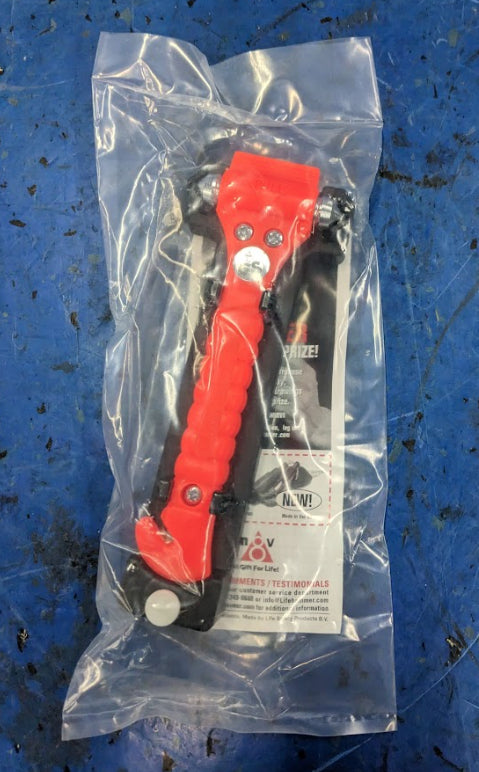 Emergency Exit Hammer.Auto Escape Hammer: Essential automobile safety equipment. Don't get trapped in your car. Use the LifeHammer auto escape tool when doors are jammed, the seat belt is stuck, and breaking the window is the only way out! Remove LifeHammer from the Mounting by pulling hammer end labeled 'pull'. Cut unreleased seat belts with the razor-sharp blade on this emergency escape hammer. Smash a side window with the quality double-tipped safety auto escape hammer. Swing this travel safety device a hammer. Escape! To escape entrapment in flooded or burning vehicle, add the LifeHammer emergency escape tool to your tool kits. Luminescent pin on auto escape hammer lets you locate it quickly even in complete darkness. Used by many firemen, police and paramedics. Fastest way to remove children's car seats in emergencies. FREE holder is included for convenient mounting and storage inside your car. Life Hammer Car Escape Hammer Travel Safety Features: LifeDon't be trapped in your car. The original orange emergency exit hammer. Cut seat belt with razor sharp cutter. Break out window with double tipped hammer. Mounting bracket. Weight: 4 oz. Length: 6.75 inches. Made in Netherlands.