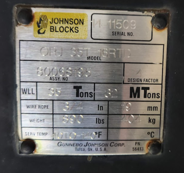 ORJ 35T 16RTD Johnson 35 Ton WLL Hook Block 3-Sheave 3/4" Wire Rope 80068195